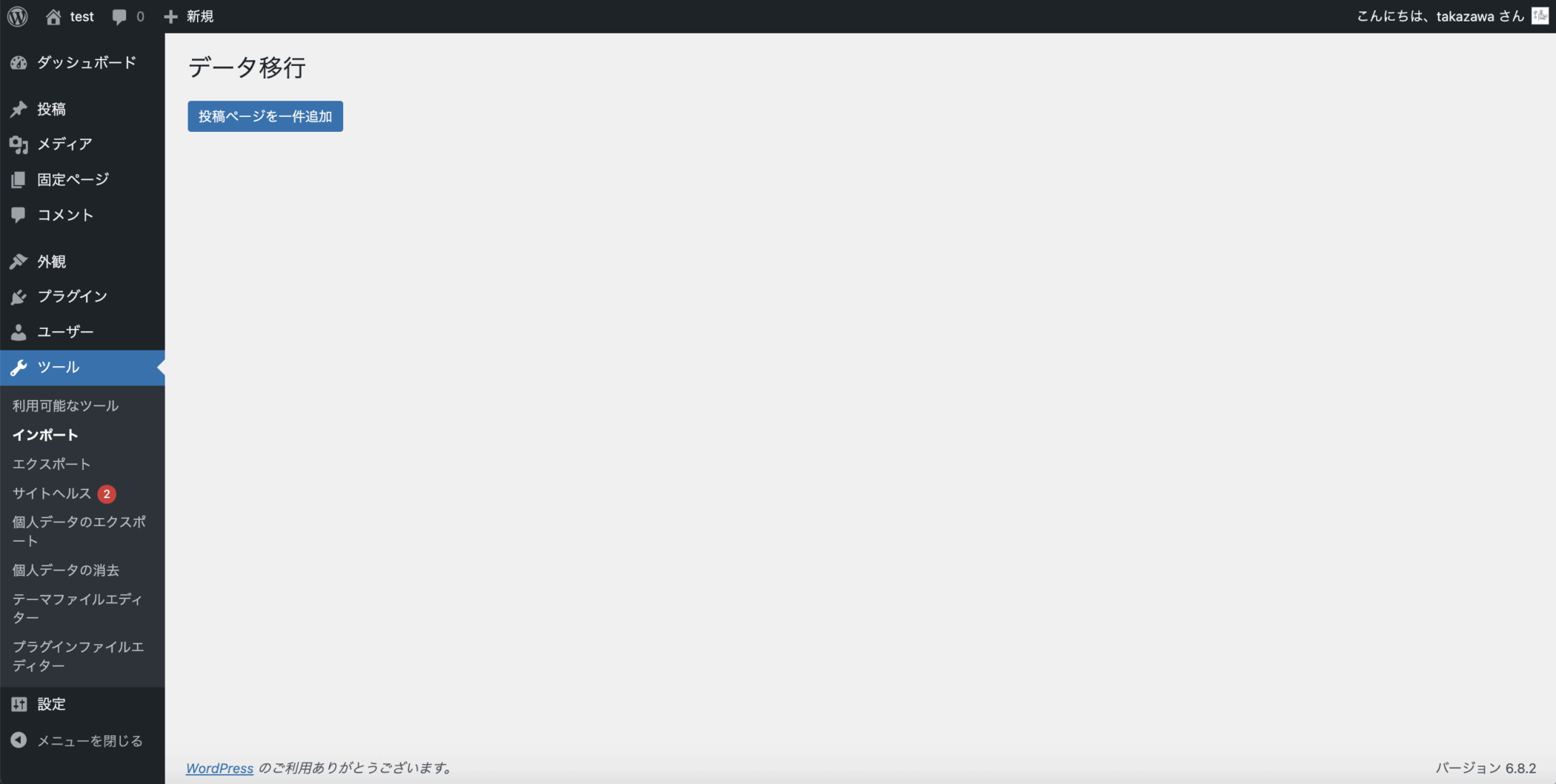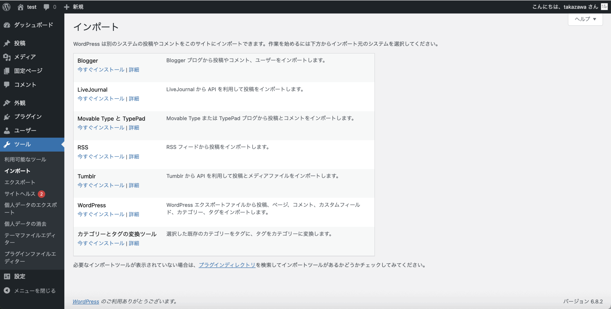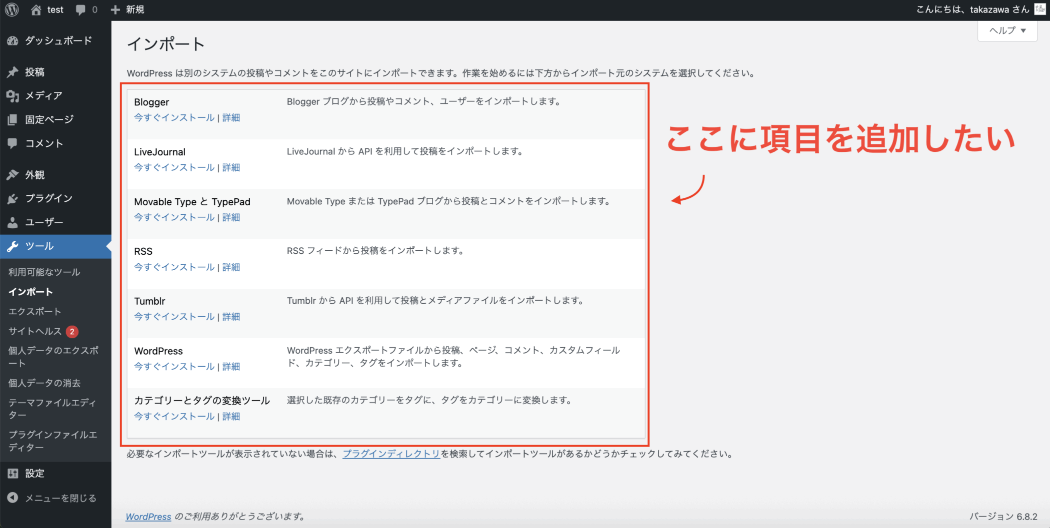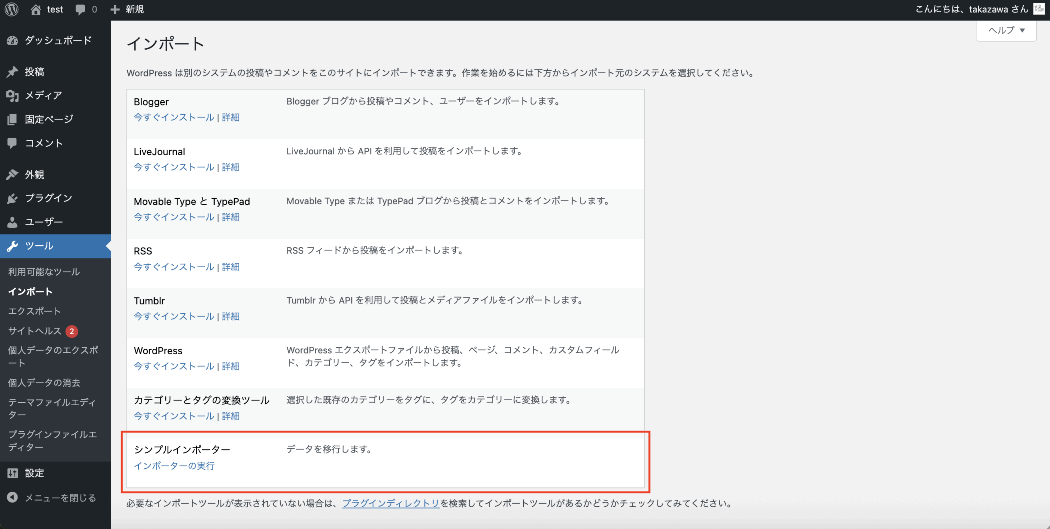 今回実装する対象の管理画面は、WordPress管理画面左メニュー「ツール」→「インポート」のページになります。
