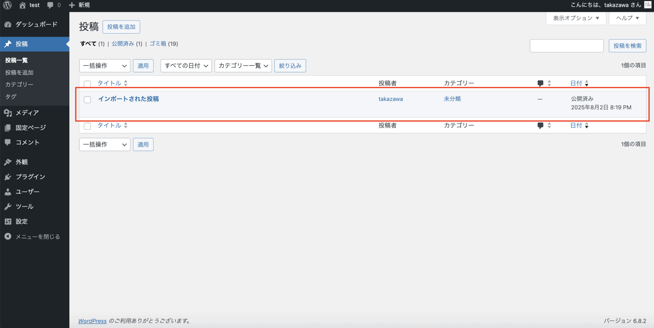 すると、下図のようにWordPress管理画面左メニュー「投稿」の「投稿一覧」からご確認いただくとダミーの投稿が一件追加されているのが確認できるかと思います。